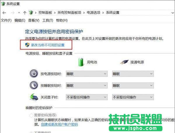 依次進入控制面板→所有控制面板項→電源選項→系統設置,點擊“更改當前不可用的設置”這個選項。