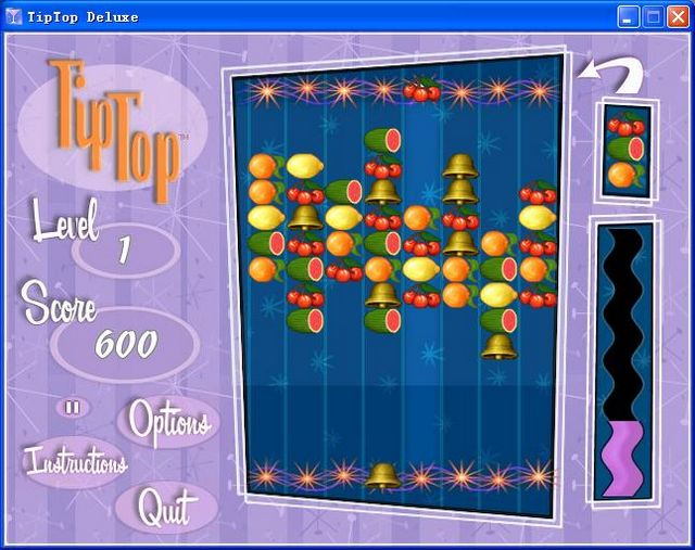 別致的水果大餐,設法把3個以上的同類水果排列在一起使之消去。與其他的消去游戲不同的是,上面和下面同時展開,上面落下的水果是你控制的,而下面的是由計算機控制的,但是你也可以通過移動上面的水果使下面的一起移動。游戲中隨著管束的不同會相繼出現一些法寶,如:吸鐵石是用來將一列水果向上吸一層的,而鐵錘的功能恰恰相反,還有可炸掉一列水果的雷管、可消去畫面上所有同一類水果的法寶以及可隨機變換的小丑等。