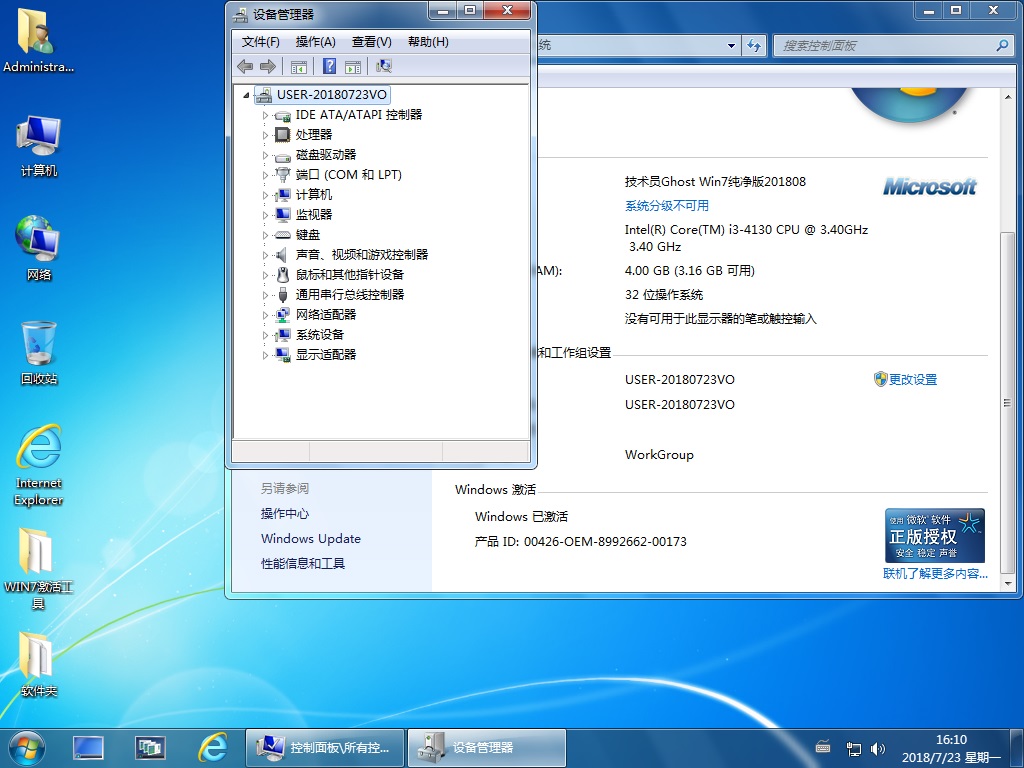 技術員 GhostWin7Sp1x32 純凈版201808 ==
